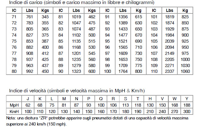 Questi due elementi messi insieme costituiscono la descrizione di servizio, e sono interdipendenti. La tabella sottostante fornisce l’indice di carico e l’indicazione di carico con il loro valore corrispondente.
