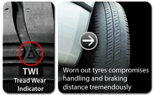 Ogni pneumatico dispone dell’indicatore di usura del battistrada che consiste in un triangolo situato sul lato. Tale indicatore segnala l’usura degli pneumatici, ed è inoltre un punto di riferimento utile a controllare se il tuo pneumatico è troppo consumato. Gli pneumatici dovrebbero essere cambiati immediatamente, non appena il livello del battistrada ha superato il simbolo.